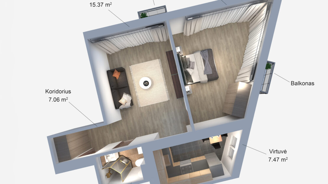 • Išplanavimas: Koridorius sujungtas su kambariu bendras plotas (23 m2) šis kambarys su balkonu i Vilniaus gatves pusę, Virtuvės zona (7,47 m2), atskiras miegamasis (19,57 m2) su balkonu į prezidentūros parkelio pusę, vonios kambarys (3,24 m2);